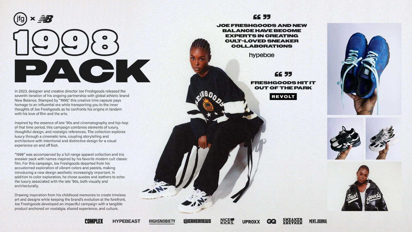 In 2023, Joe Freshgoods collaborated with New Balance on "1998", a creative homage that explores his origins and love for film and the arts. Inspired by the cinematography and hip-hop of that era, the collection merges luxury with nostalgic references from the cult classic Belly. The campaign emphasizes storytelling and unique design, offering a cinematic experience on and off foot.