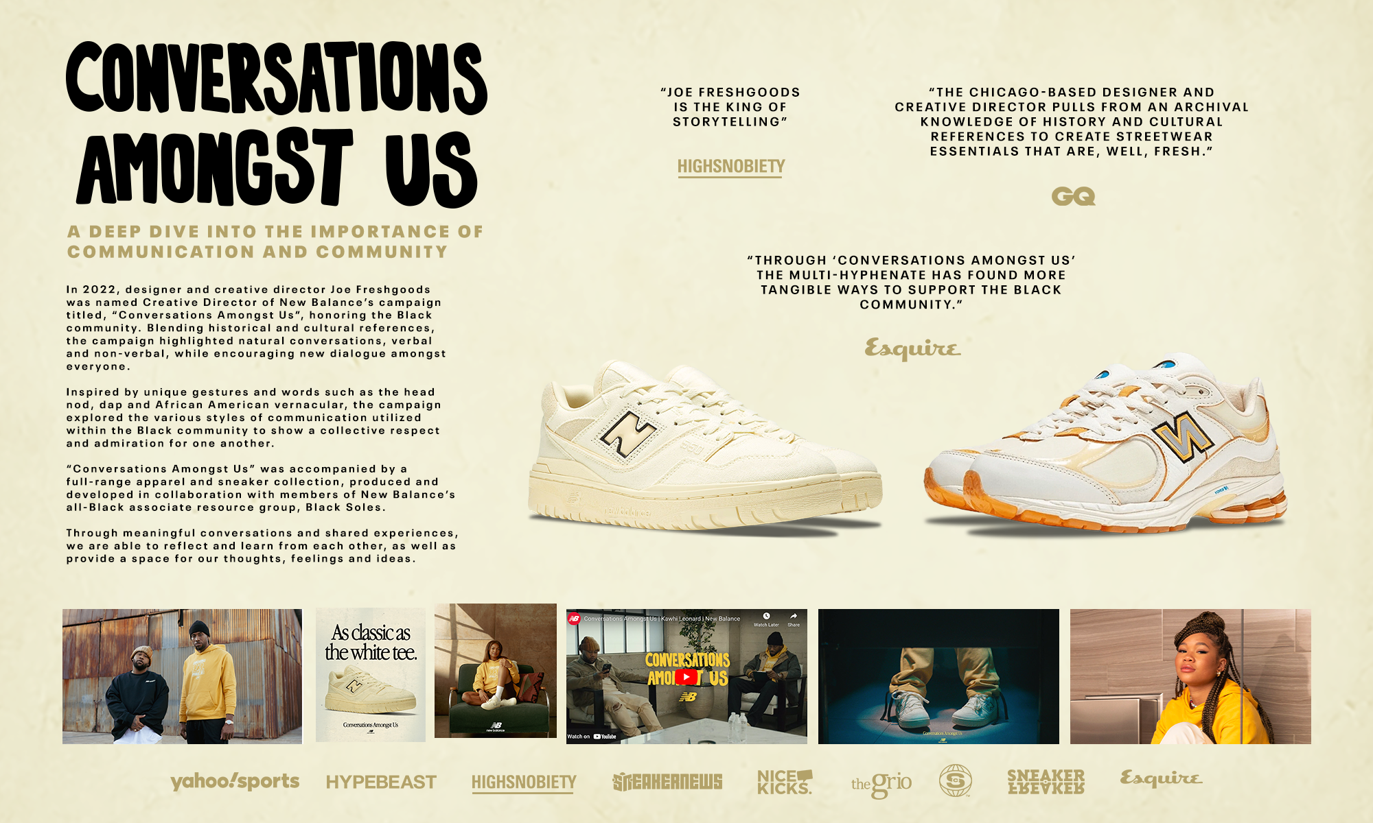 Additionally, “Conversations Amongst Us” was accompanied by a full range apparel and sneaker collection, produced and developed in collaboration with members of New Balance’s all-Black associate resource group, Black Soles. Following the release of the collection Joe Freshgoods took the campaign on the road for a intimate conversation in Atlanta where he expanded on his inspiration for the campaign, storytelling, historical references and the importance of communication.
